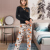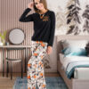 Bisiklet yaka ve uzun kollu, yaka kısmından nakış işlemeli yeni sezon kadın pijama takımı modelidir.