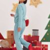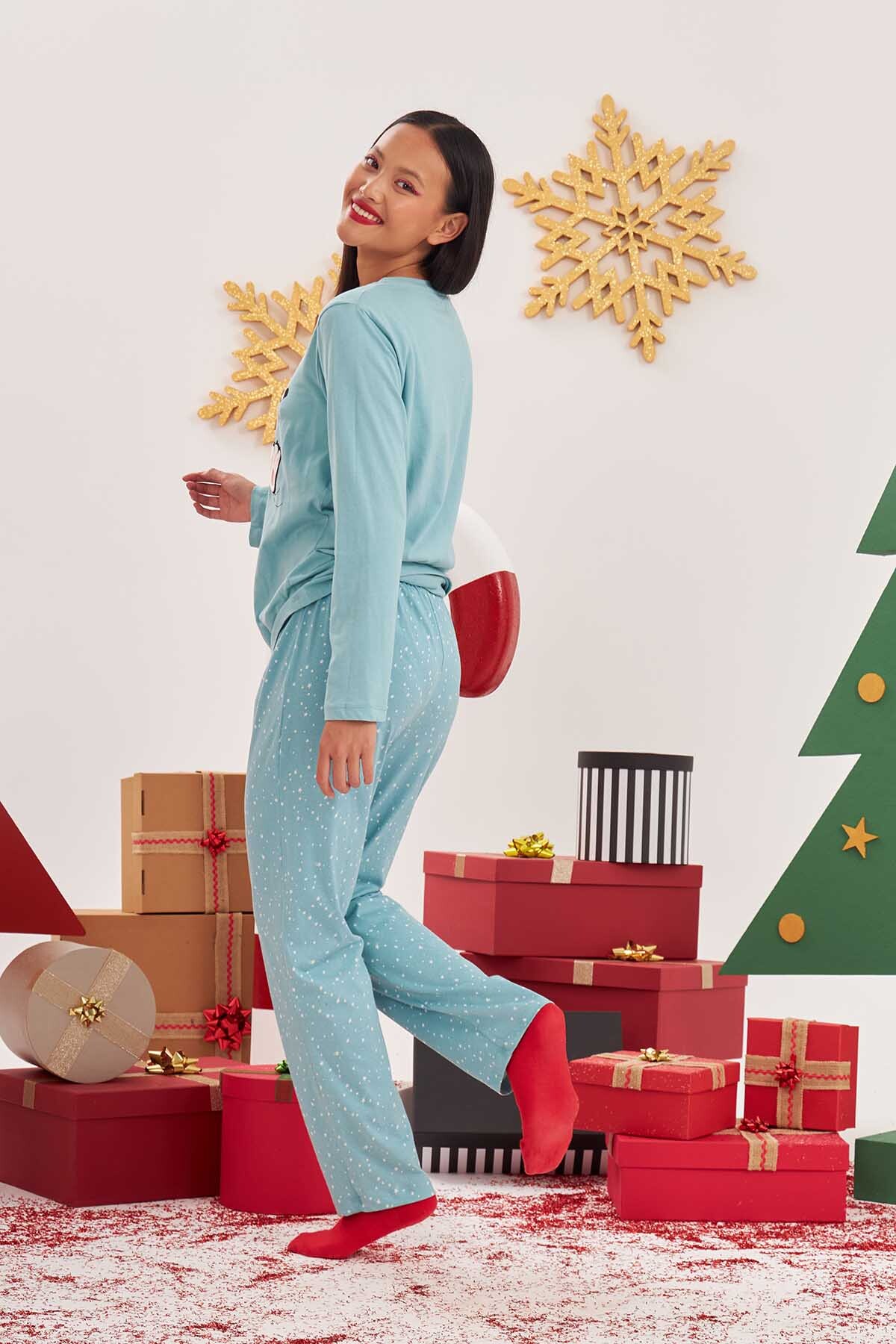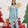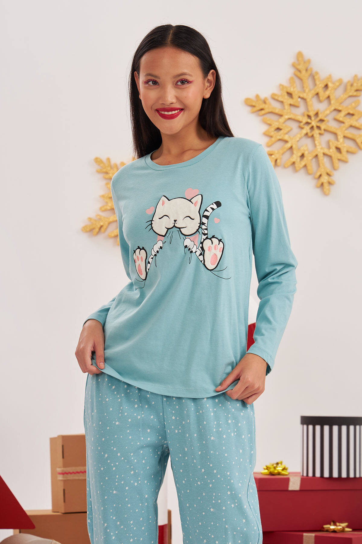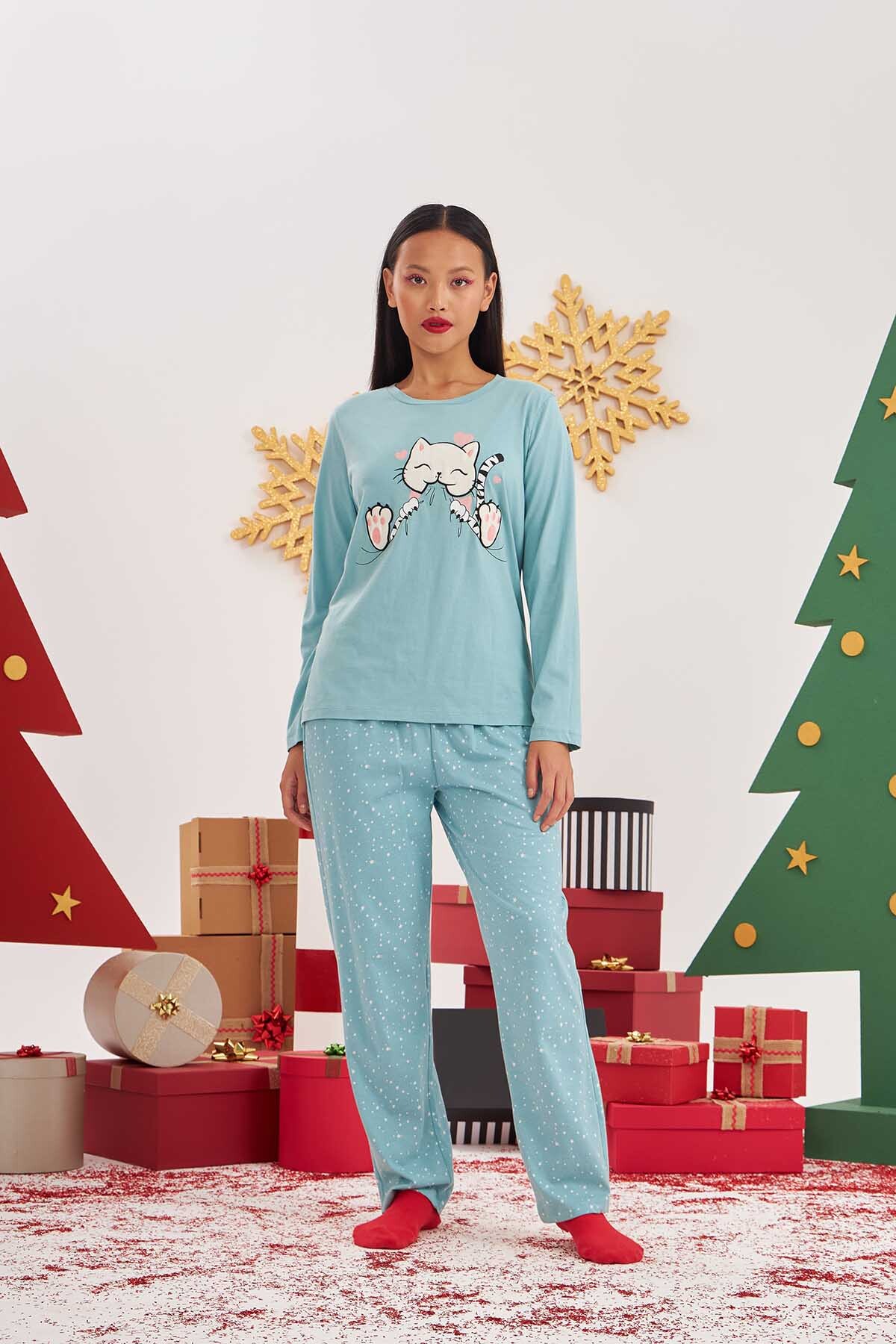 Yeni sezon çok şık kedi baskılı uzun kol kadın pijama takım modelidir.