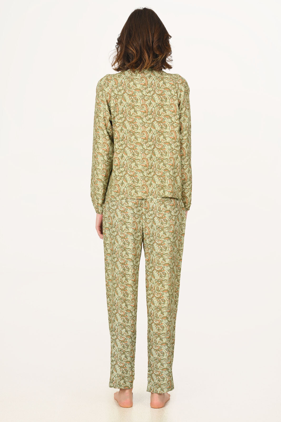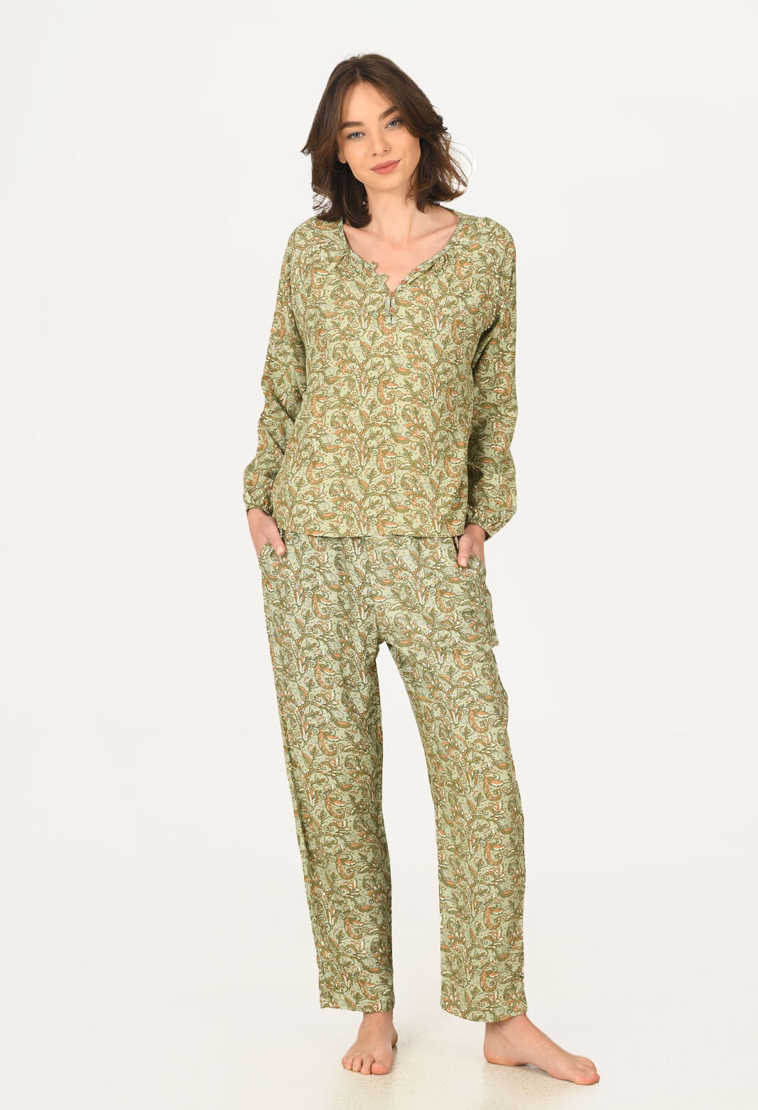 Yeni sezon yaprak desenli yaka kısımlarından düğmeli otantik pijama takım modelidir.